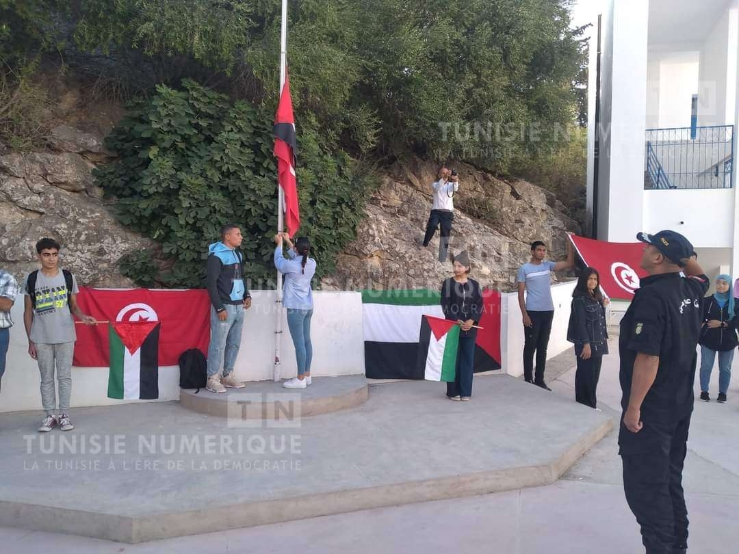 تم صباح اليوم الإثنين 9 أكتوبر 2023، رفع العلم الفلسطيني وتحيته إلى جانب العلم التونسي وبث النشيدين الوطنيين التونسي الفلسطيني بالمعهد الثانوي علي البلهوان بباجة.