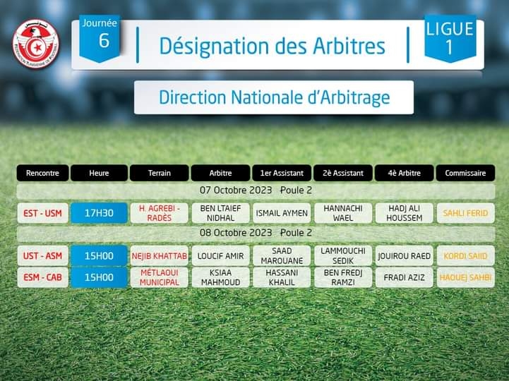 Ci-après la désignation complète des arbitres qui siffleront les matches de la 6ème journée de Ligue 1 pro, publiée par la DNA :