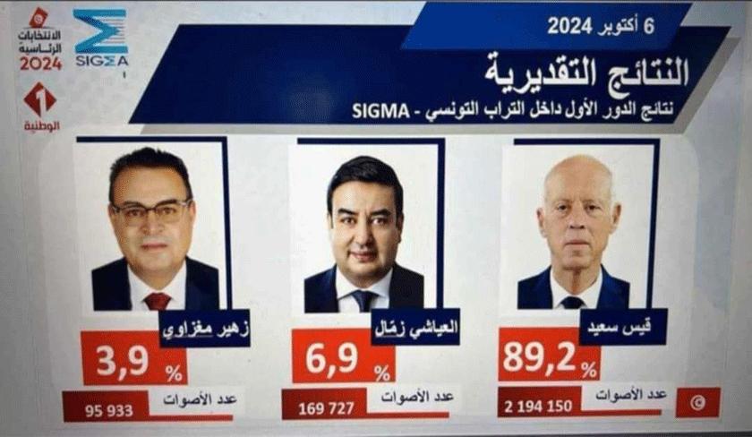 Le candidat Kais Saied a obtenu 90.69% des voix aux élections présidentielles en Tunisie, suivi en deuxième position par le candidat Ayachi Zammal avec 7.35% des voix, et en troisième place Zouhair Maghzawi avec 1.97% des voix, selon les résultats