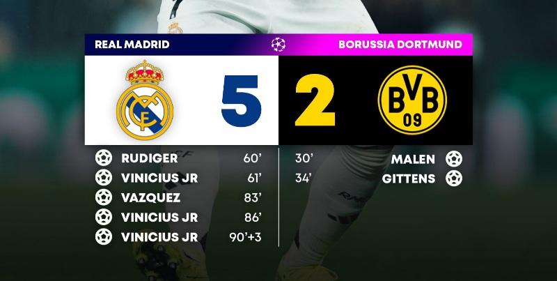 حقق ريال مدريد ''ريمونتادا'' مساء اليوم الثلاثاء على ضيفه بوروسيا دورتموند بخماسية لهدفين بعدما تأخر في الشوط الأول بهدفين دون رد أمام الفريق الألماني.وافتتح دورتموند النتيجة عن طريق مالن في الدقيقة 30 قبل أن يضيف غيتانز الهدف الثاني في الدقيقة 34.وف